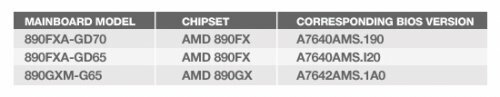 А именно, платы — MSI 890FXA-GD70, 890GXM-G65 b 890FXA-GD65. Производитель также сообщил, что все новые партии этих плат будут изначально прошиты новым BIOS. Компания MSI не первой сообщила о поддержке новых процессоров при помощи простого обновления BIOS. ASUS, еще на прошлой неделе уведомила об этом и тоже представила список поддающихся перепрошивке материнок. Но в обоих случаях, что с MSI, что с Asus речь идёт о материнских платах, основанных на чипсетах 890FX и 890GX.